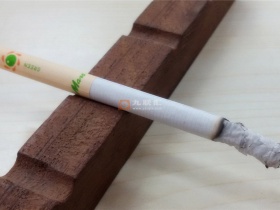 烟支细长,用大陆时下流行的分类来说是一款中支烟。水松纸上的爆珠位置很靠嘴唇,难道是为了方便咬破?拆开看才知道,这烟是活性炭+爆珠二元滤嘴结构,能有效滤除烟气有害成分的活性炭段显然不能放在嘴端,因此将爆珠向嘴唇方向挤压了。